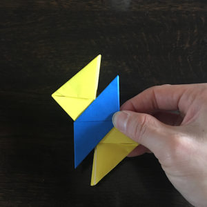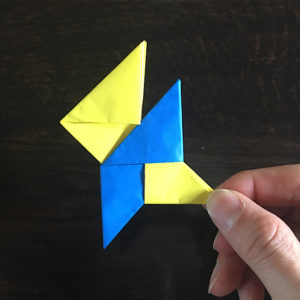 外側に出ている青の角を黄色の真ん中の切れ目に入れます。