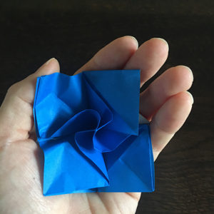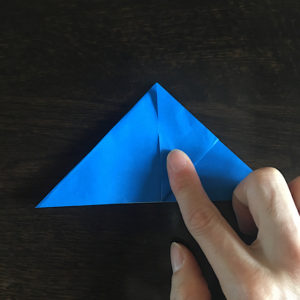 折り紙を左手で下から支えながら、左右好きな方にギュッと角をひねります。