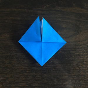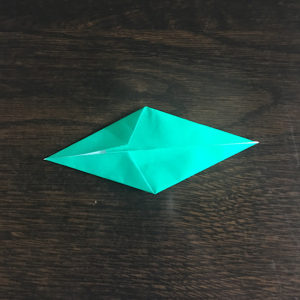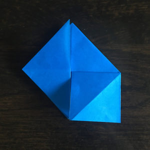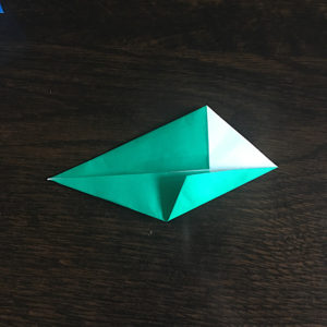 そしたら折り紙をくるっと回してピラピラしてる方を下にし、下の角を上に折り上げます。