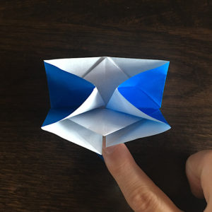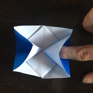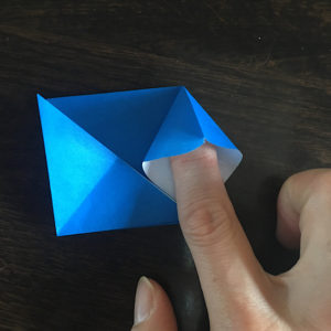 今折った所を立てて、真ん中に人差し指を優しく奥まで入れます。この時折り紙の下地はちゃんと押さえて置いて下さいね!
