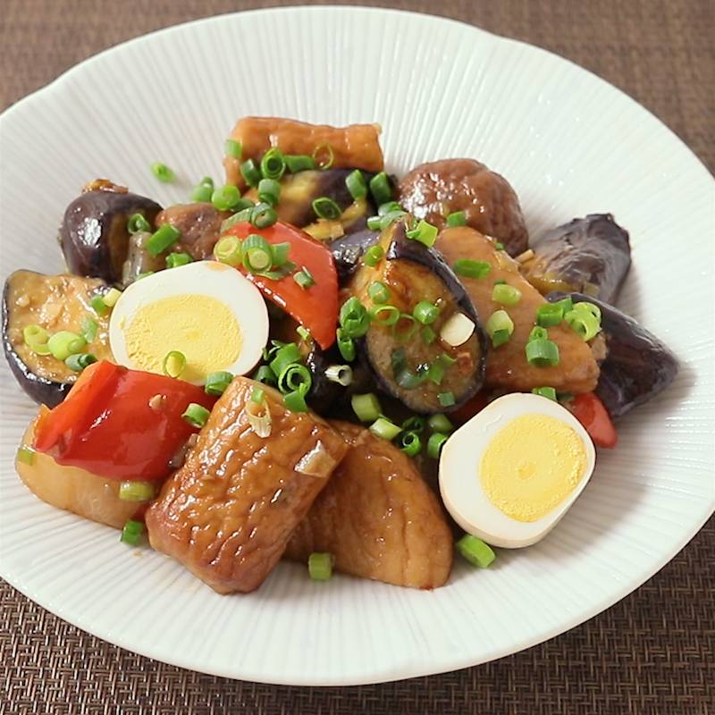 おでんの具材とナスをピリ辛の味付けで炒めれば、