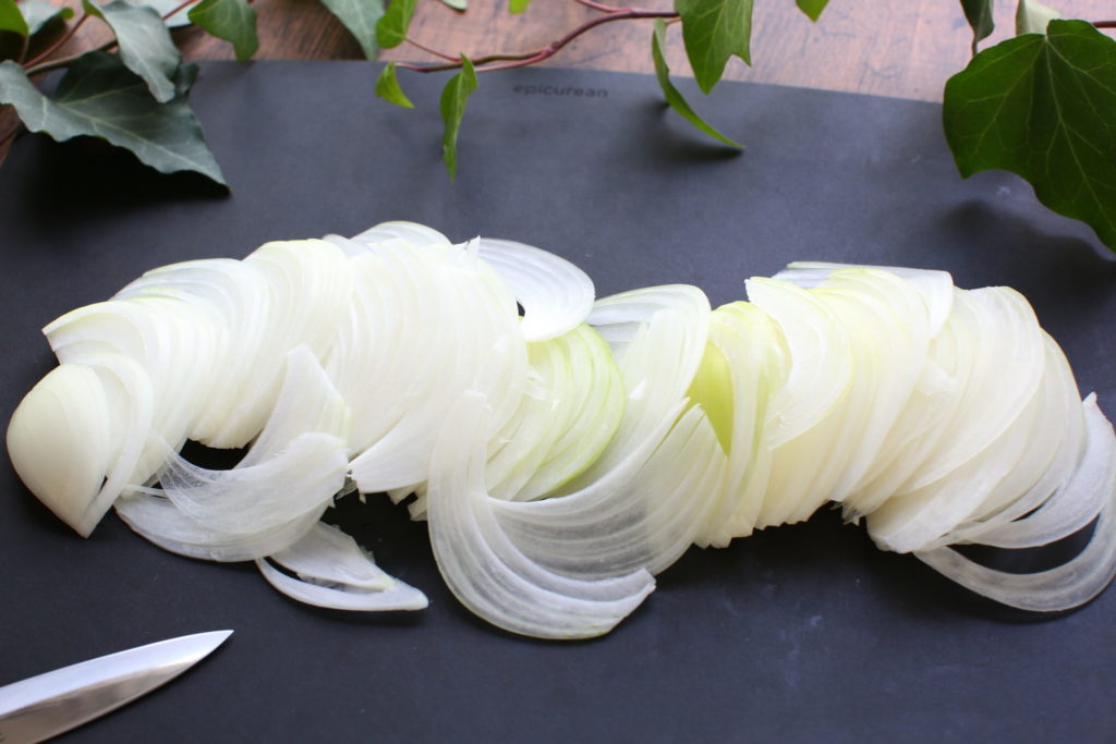 もし玉ねぎの辛味が苦手なのでしたら、玉ねぎは横向きにしてスライスしていくと良いでしょう。