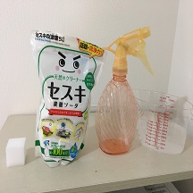 まず、霧吹きにセスキ炭酸ソーダを入れ、分量通りの水を入れてセスキ炭酸ソーダ水を作ります。
