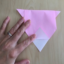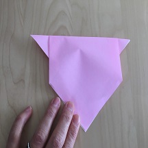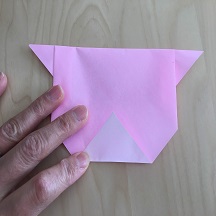 下の角を上に折り、裏返して同様に折ります。目や鼻を書いて完成です。